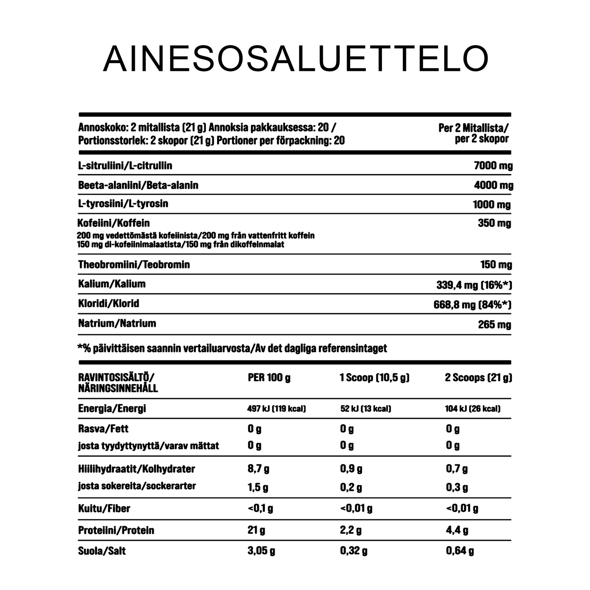 Ainesosat: L-sitrulliini, beeta-alaniini, happamuudensäätöaine (sitruunahappo), maltodekstriini (maissista), paakkuuntumisenestoaineet (kalsiumsilikaatti, trikalsiumfosfaatti, piidioksidi, maltodekstriini), L-tyrosiini, suola (natriumkloridi), kaliumkloridi, aromi, makeutusaine (sukraloosi), kofeiini (vedetön), di-kofeiinimalaatti (75% kofeiinia), teobromiini, makeutusaine (asesulfaami K), aromivärit (antosyaanit, beetakaroteeni). Valmistettu Ruotsissa.